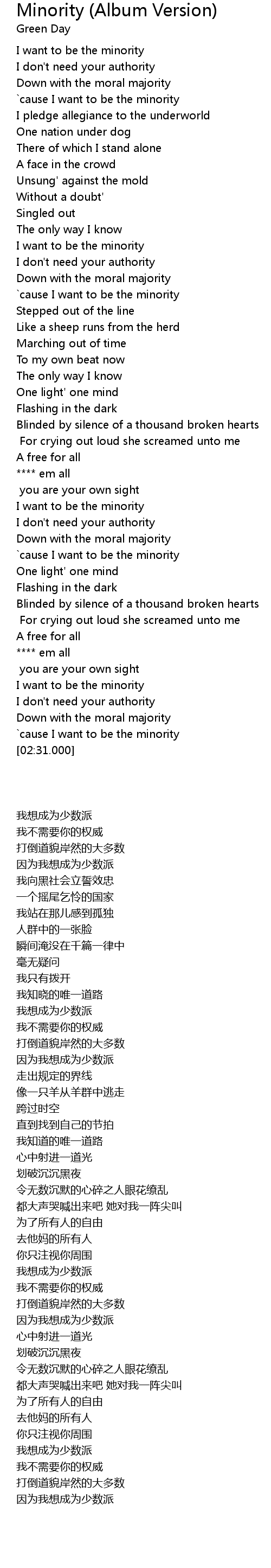 | [02:08.000] | I want to be the minority |