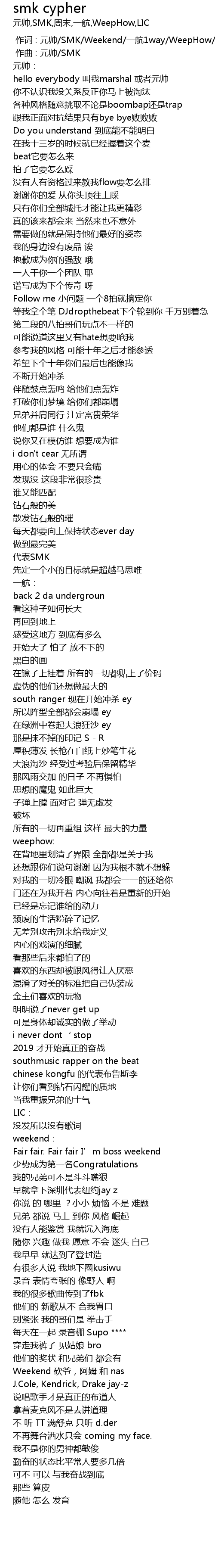 [00:00.000] 作词 : 元帅/SMK/Weekend/一航1way/WeepHow/CRAZY LIC