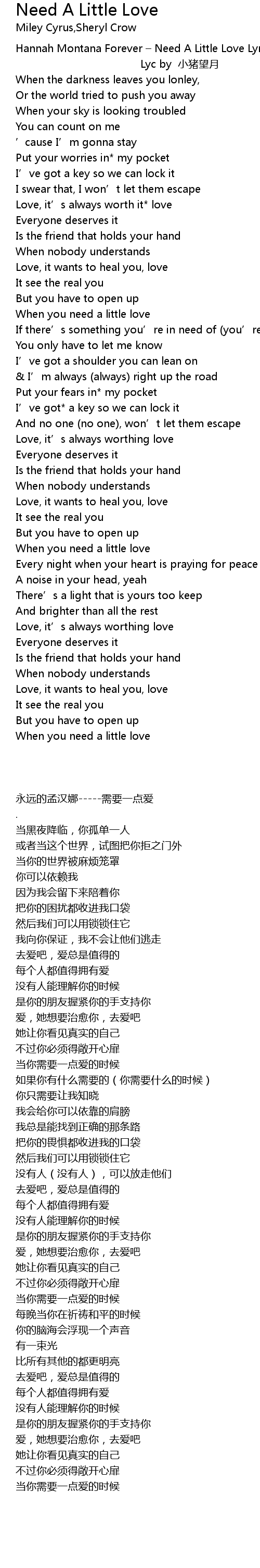 | [00:03.54] | Hannah Montana Forever – Need A Little Love Lyrics |