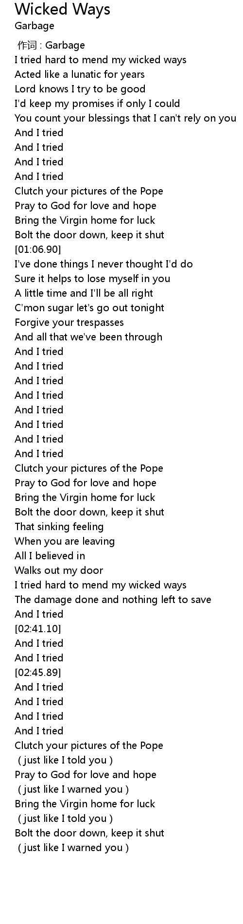 | [02:24.29] | I tried hard to mend my wicked ways |
