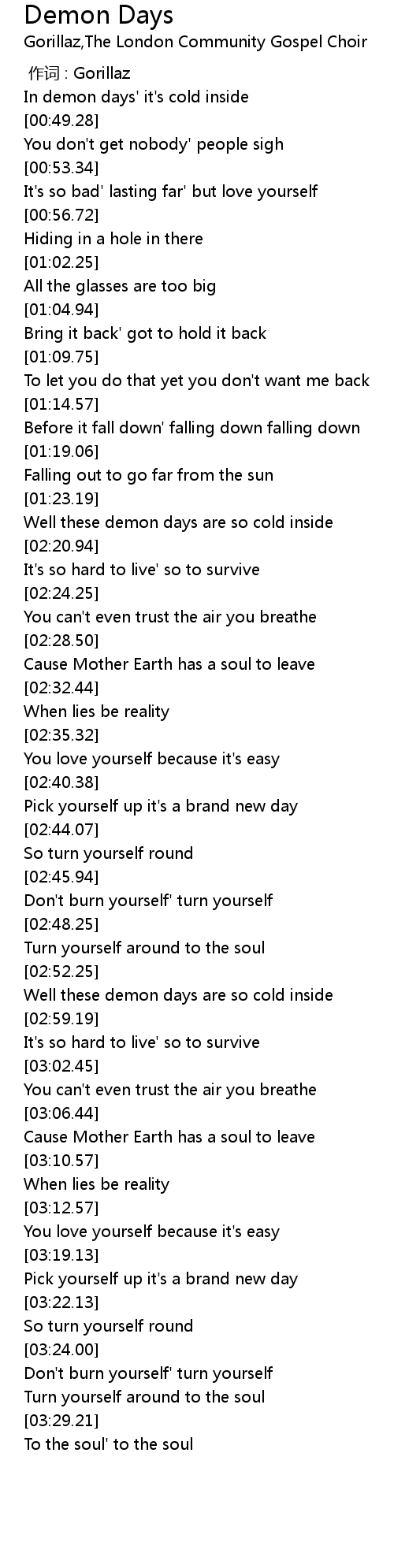 | [00:47.34] | In demon days' it's cold inside |