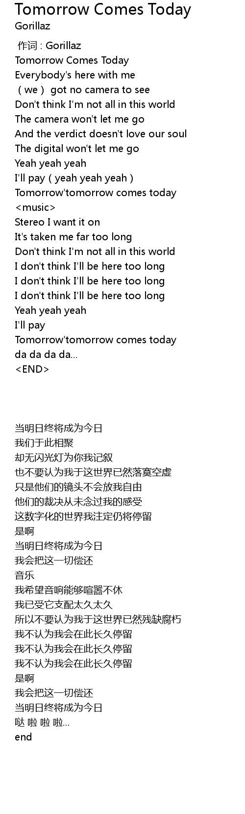 | [00:01.99] | Tomorrow Comes Today |