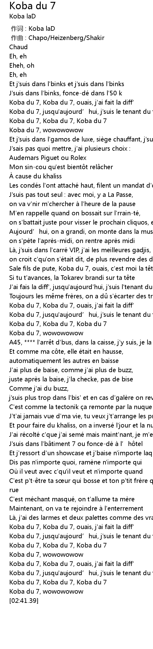 | [02:27.34] | Koba du 7, Koba du 7, ouais, j'ai fait la diff' |