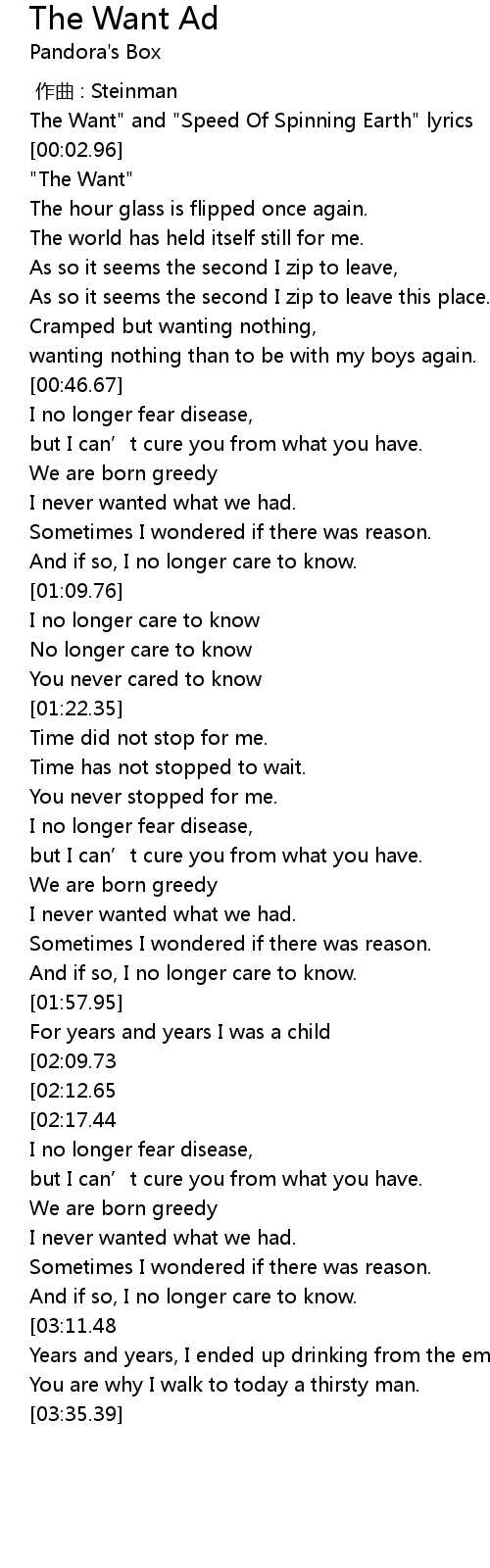 | [00:00.31] | The Want" and "Speed Of Spinning Earth" lyrics |