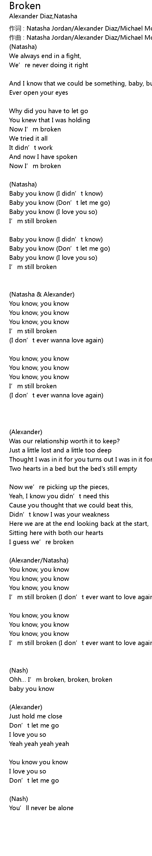 | 作词 : Natasha Jordan/Alexander Diaz/Michael McDermott | |