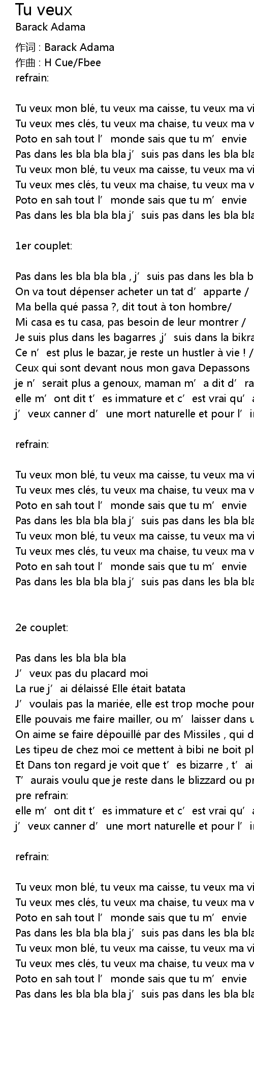 | Tu veux mon blé, tu veux ma caisse, tu veux ma vie/ | |