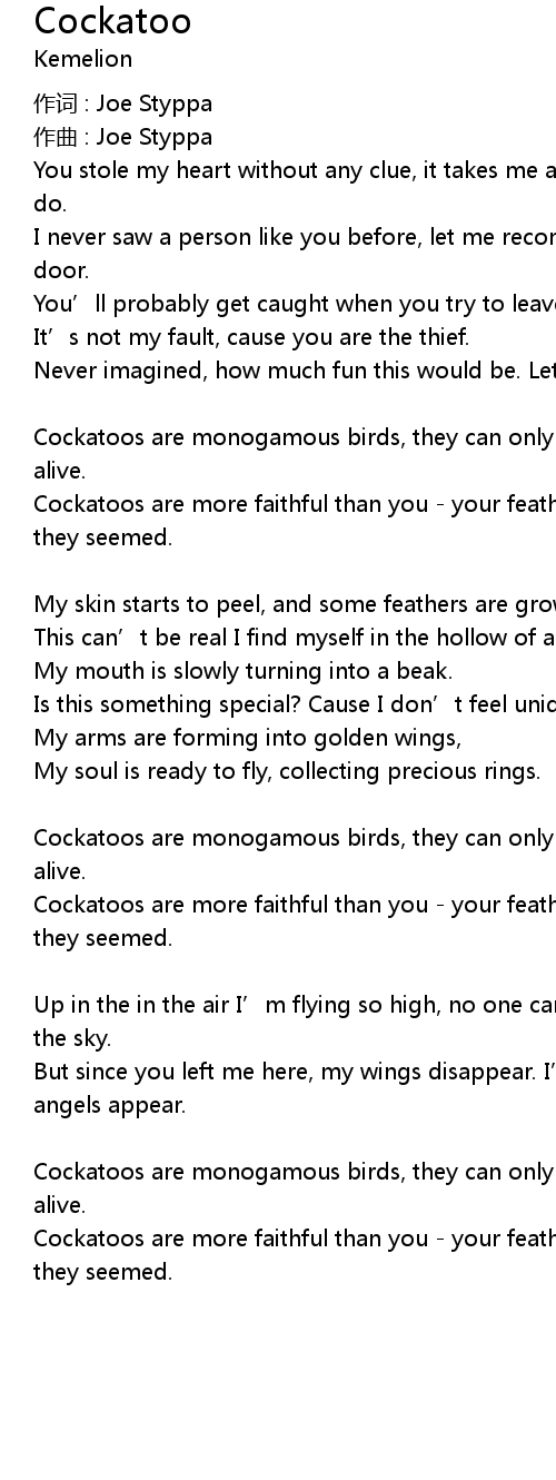 | Cockatoos are more faithful than you your feathers, your beak, were not what they seemed. | |