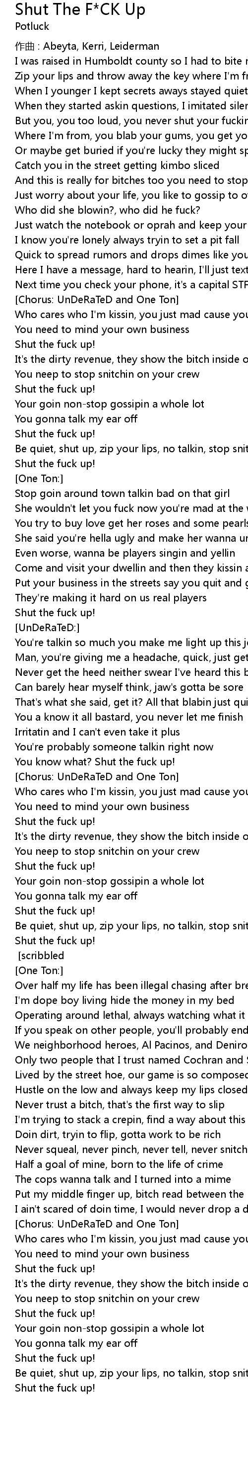 | Be quiet, shut up, zip your lips, no talkin, stop snitchin, quit bitchin | |