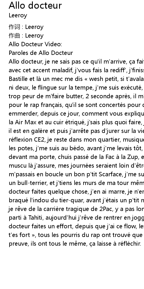 | Allo docteur, je ne sais pas ce qu' il m' arrive, a fait 2 jours que j' galè re avec cet accent maladif, j' vous fais la rediff', j' finissais ma cr pe à Bastille et là un mec me dis wesh petit, si t' avalais la pastille , ni une ni deux, le flingue sur la tempe, j' me suis exé cuté, chuis pas dingue, j' avis trop peur de m' faire butter, 2 seconde aprè s, il m' dis qu' j' ai trop d' style pour le rap fran ais, qu' il se sont concerté s pour qu' j' arr te de les emmerder, depuis ce jour, comment vous expliquez, je voue un vé ritable culte à la Air Max et au cuir é triqué, j' sais plus quoi faire, j' ai plus qu' un flow et il est en galè re et puis j' arr te pas d' jurer sur la vie d' ma mè re, niveau de ré flexion CE2, je reste dans mon quartier, musique à fond dans le poste, pour les potes, j' me suis au bé do, avant j' me levais t t, maintenant je m' endors devant ma porte, chuis passé de la Fac à la Zup, en revanche à la salle de muscu là j' assure, mes journé es seraient loin d' tre parfaites, si je m' passais en boucle un bon p' tit Scarface, j' me suis acheté un pit, un rot et un bullterrier, et j' tiens les murs de ma tour m me les jours fé rié s, docteur faites quelque chose, j' en ai marre, je n' en peux plus, j' ai m me braqué l' indou du tierquar, avant j'é tais un p' tit mec tout calme, maintenant je r ve de la carriè re tragique de 2Pac, y a pas longtemps j' aurais aimé parti à Tahiti, aujourd' hui j' r ve de rentrer en jogging au VIP, sé rieux docteur faites un effort, depuis que j' ai ce flow, les nuls me dise putain, t' es fort , tous les pourris du rap ont trouvé que ce style dé chire, la preuve, ils ont tous le m me, a laisse à ré flé chir. |