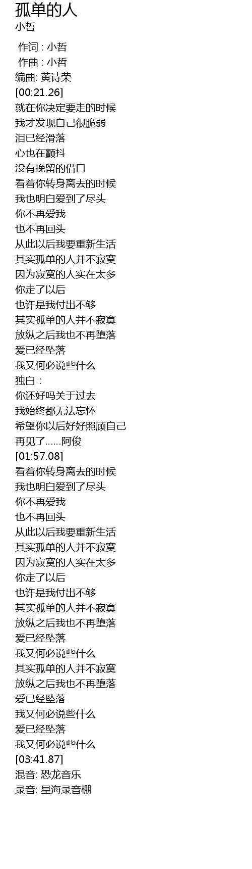 | [01:26.80] | 其实孤单的人并不寂寞 |