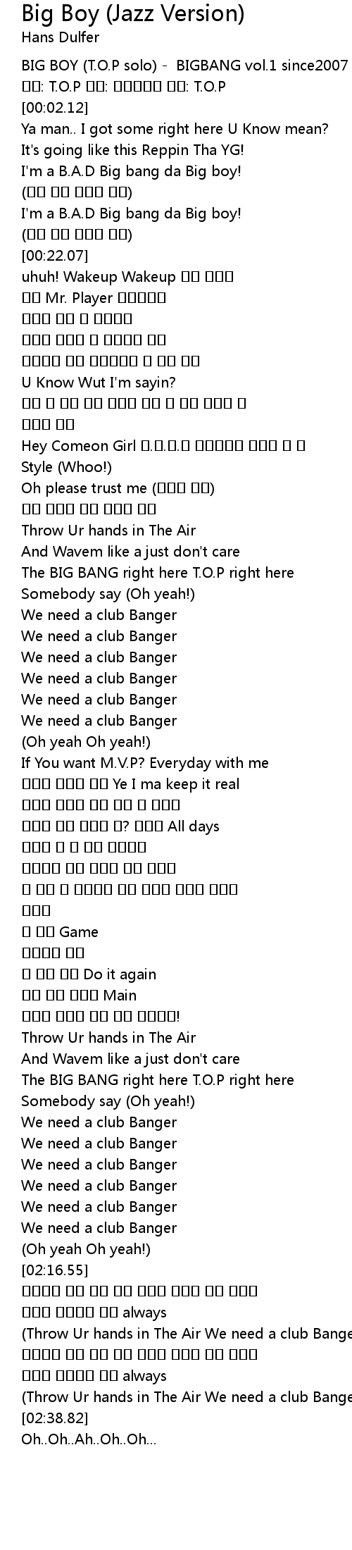 | [00:01.21] | BIG BOY (T.O.P solo) - BIGBANG vol.1 since2007 |