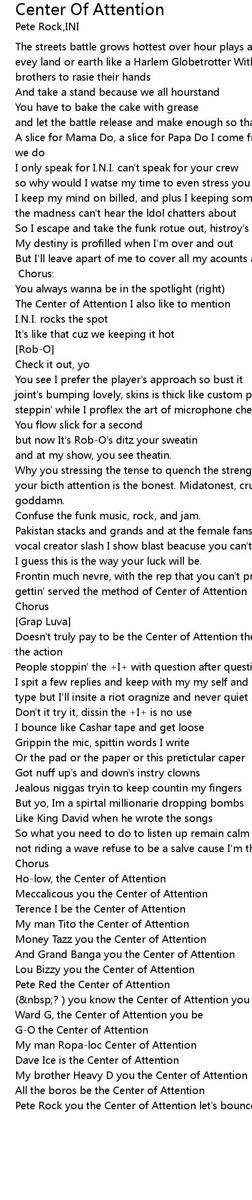 | Doesn't truly pay to be the Center of Attention the main atraction gettin' all the action | |
