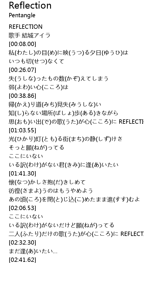 | [00:52.33] | 思(おも)い出(で)の歌(うた)が心(こころ)に REFLECTION |