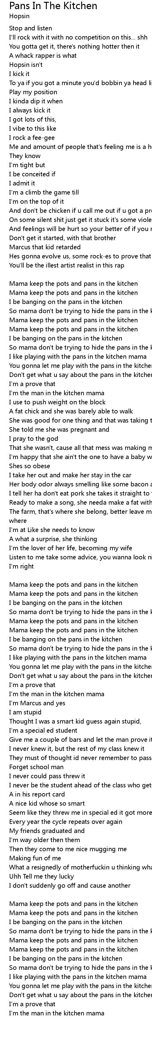So mama don't be trying to hide the pans in the kitchen |