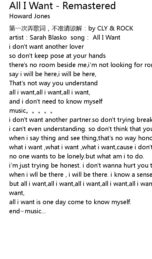 | [02:43.77] | but all i want, all i want, all i want, all i want, all i want, say all i want, |