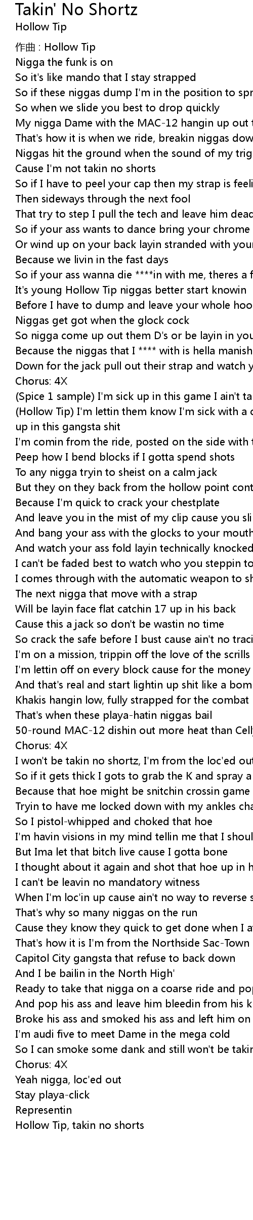 | Hollow Tip I' m lettin them know I' m sick with a clip and ain' t takin no shorts up in this gangsta shit | |