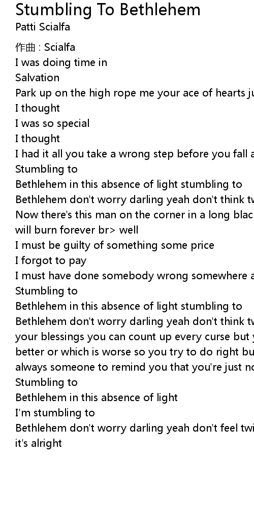 | Bethlehem don' t worry darling yeah don' t think twice now you can count up all your blessings you can count up every curse but you never really know which is better or which is worse so you try to do right but it gets so rough there' s always someone to remind you that you' re just not good enough and you' re | |