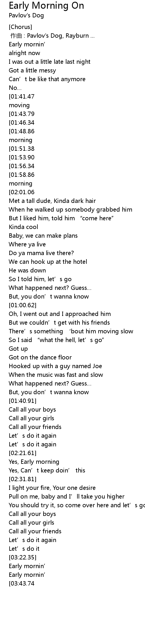 | [02:59.53][01:58.86][01:18.44][00:37.87] | And it don’t stop till the early morning |
