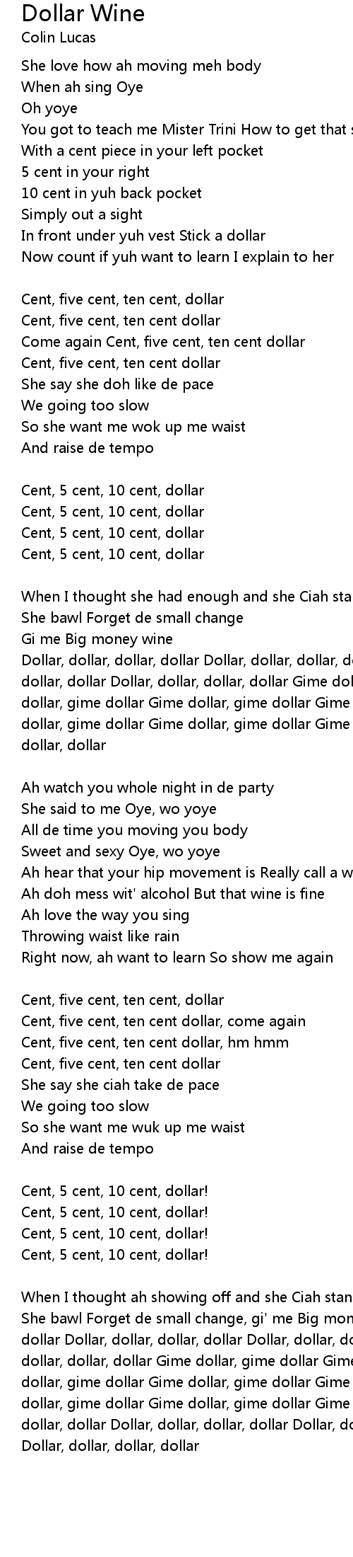 She bawl Forget de small change, gi' me Big money wine Dollar, dollar, dollar, dollar Dollar, dollar, dollar, dollar Dollar, dollar, dollar, dollar Dollar, dollar, dollar, dollar Gime dollar, gime dollar Gime dollar, gime dollar Gime dollar, gime dollar Gime dollar, gime dollar Gime dollar, gime dollar Gime dollar, gime dollar Gime dollar, gime dollar Gime dollar, dollar Dollar, dollar, dollar, dollar Dollar, dollar, dollar, dollar Dollar, dollar, dollar, dollar Dollar, dollar, dollar, dollar |