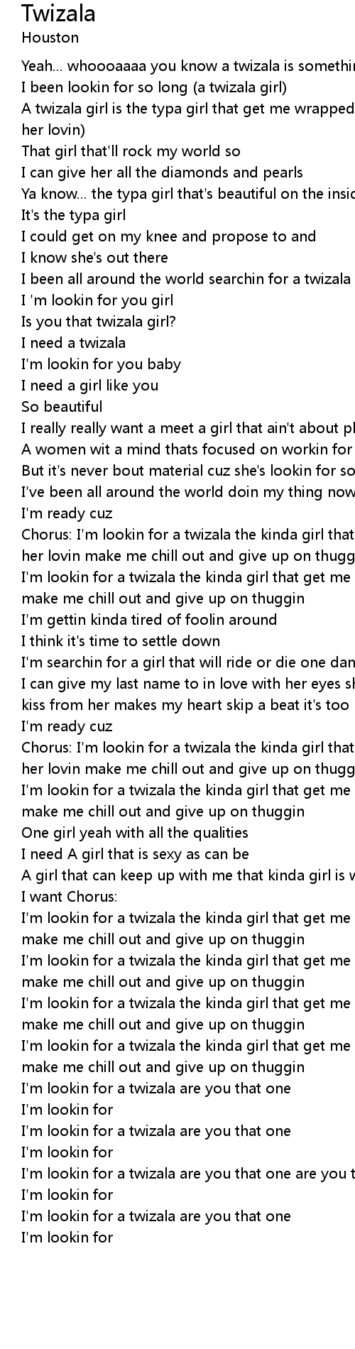 I been all around the world searchin for a twizala girl |