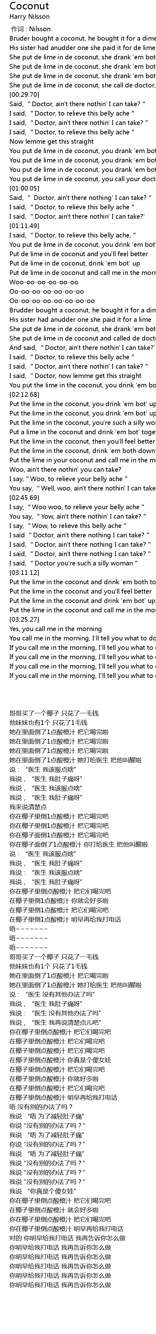 | [00:56.42] | You put de lime in de coconut, you call your doctor, woke 'im up |