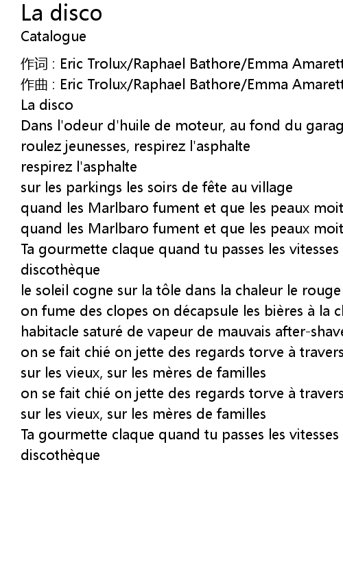 | 作词 : Eric Trolux/Raphael Bathore/Emma Amaretto | |