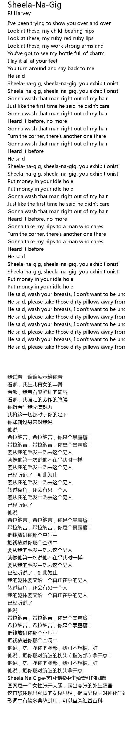 | [01:59.00] | Sheela-na-gig, sheela-na-gig, you exhibitionist! |