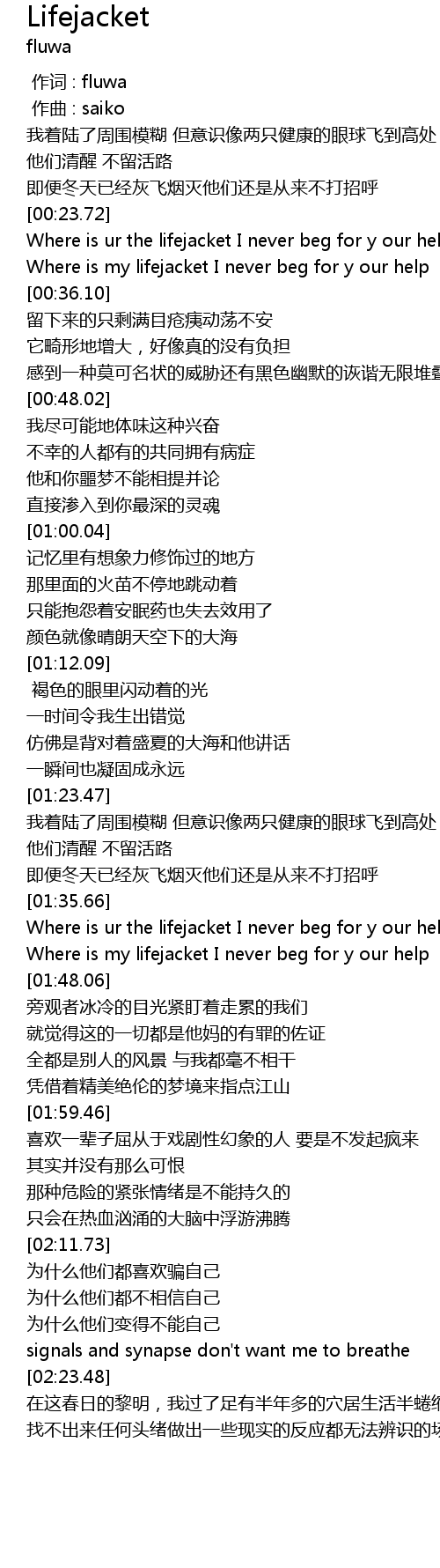 | [01:36.13] | Where is ur the lifejacket I never beg for y our help |