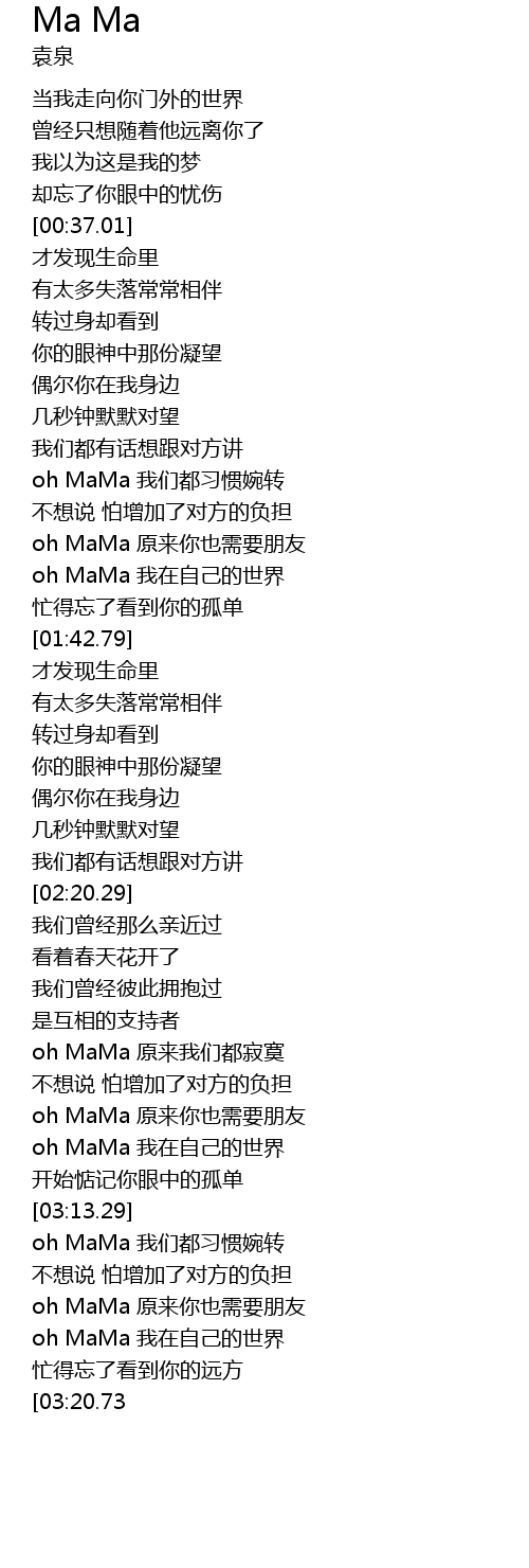 | [03:50.16] | oh MaMa 原来你也需要朋友 |