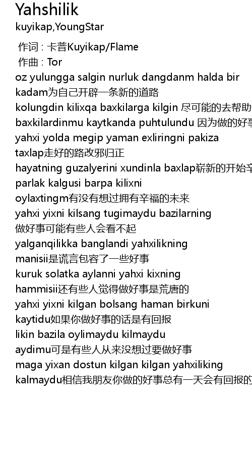| [01:58.103] | yahxi yixni kilgan bolsang haman birkuni kaytidu如果你做好事的话是有回报 |