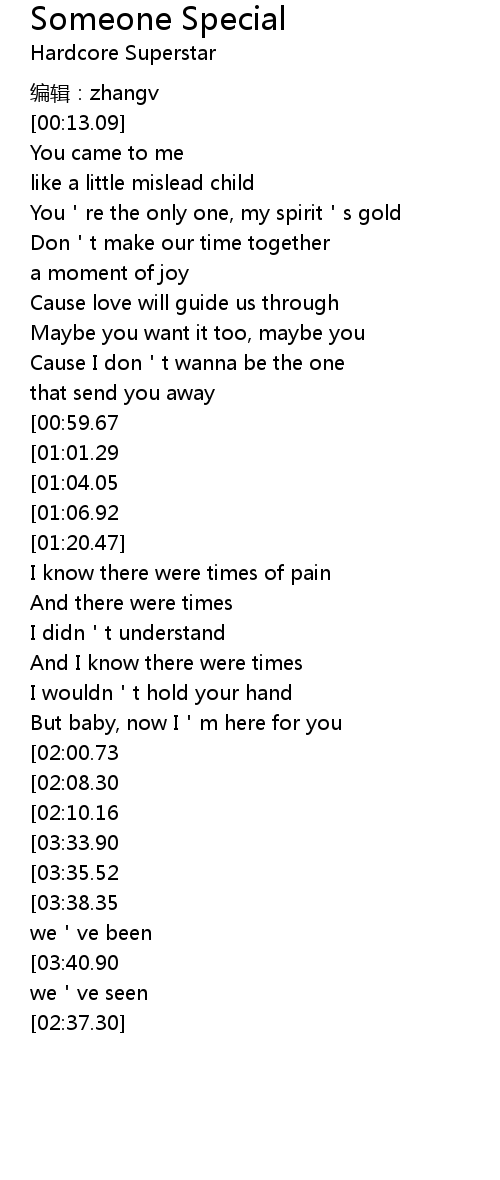 | [03:45.47][03:35.52][03:24.78][03:14.72][02:28.58][02:18.44] | someone special one |
