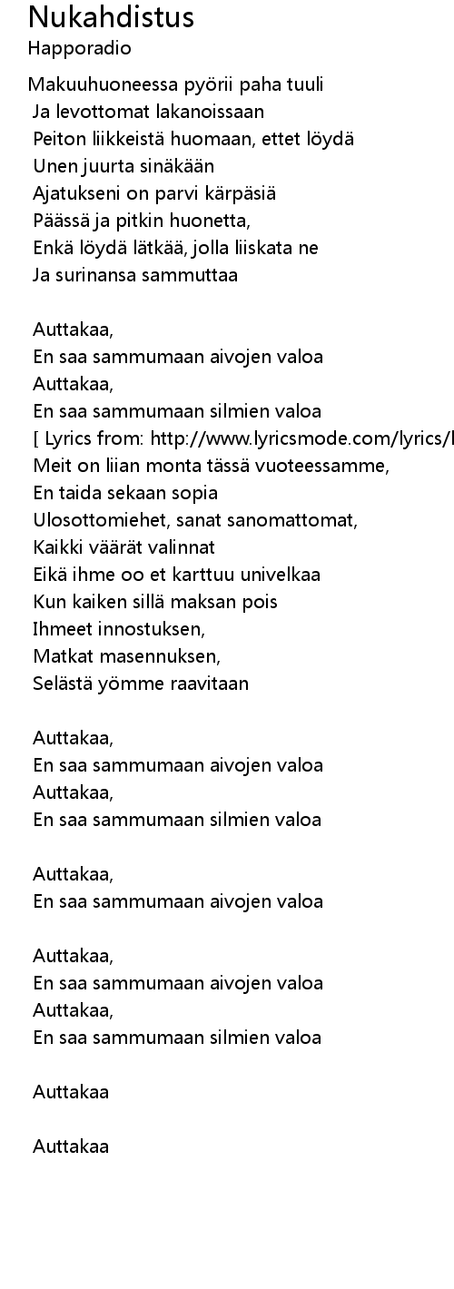 | Lyrics from: http: www. lyricsmode. com lyrics h happoradio nukahdistus. html | |