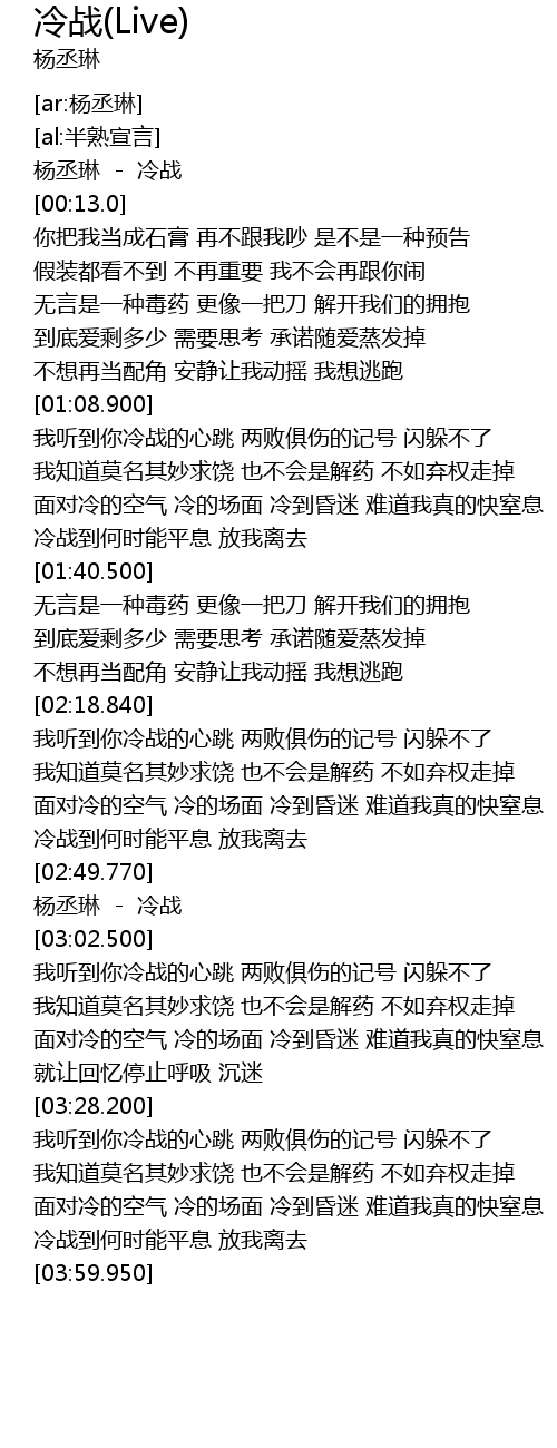 | [00:01.0] | 杨丞琳 - 冷战 |