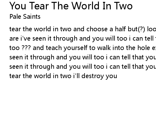 | tear the world in two and choose a half but(?) look inside you you are what you are i've seen it through and you will too i can tell that you feel these things too ??? and teach yourself to walk into the hole exploding in your heart i've seen it through and you will too i can tell that you feel these things too i've seen it through and you will too i can tell that you feel these things too you tear the world in two i'll destroy you |