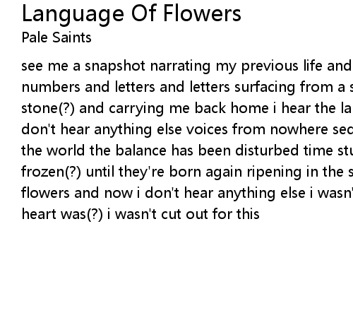 see me a snapshot narrating my previous life and a mountain of other lies numbers and letters and letters surfacing from a sea of treacle blackened stone(?) and carrying me back home i hear the language of flowers and now i don't hear anything else voices from nowhere seducing me to all the lyrics(?) of the world the balance has been disturbed time stumbles drunkenly wild lives are frozen(?) until they're born again ripening in the sun i hear the language of flowers and now i don't hear anything else i wasn't cut out for this but my heart was(?) i wasn't cut out for this |