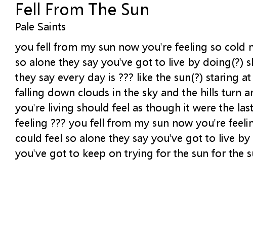 you fell from my sun now you're feeling so cold never thought morning could feel so alone they say you've got to live by doing(?) she says she felt so alone(?) they say every day is ??? like the sun(?) staring at cloud and your rains falling down clouds in the sky and the hills turn around they say every day you're living should feel as though it were the last they say hold on to that feeling ??? you fell from my sun now you're feeling so cold never though morning could feel so alone they say you've got to live by doing she felt ??? they say you've got to keep on trying for the sun for the sun |