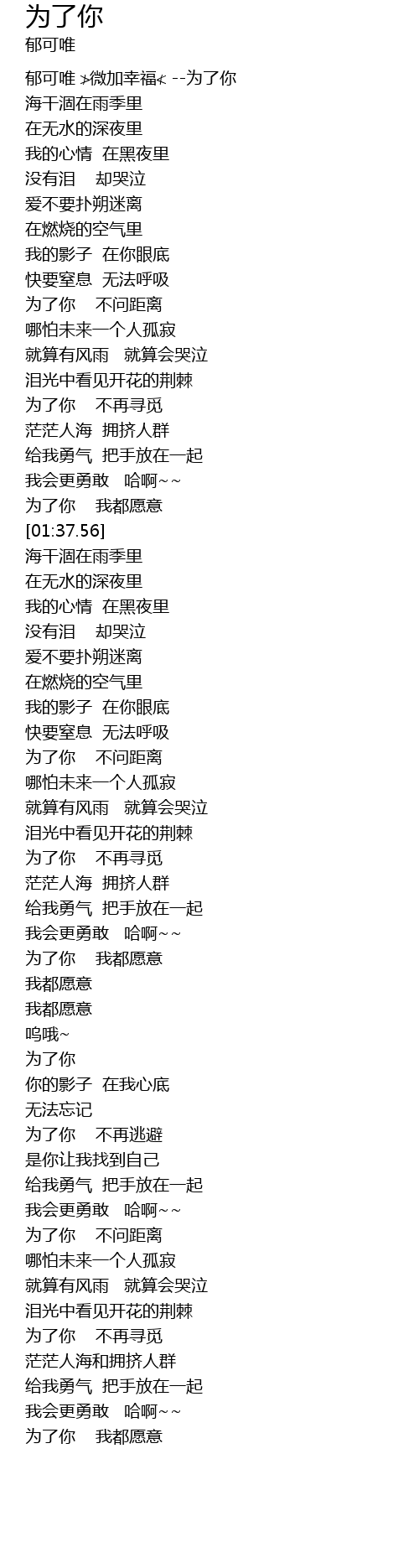 | [00:01.33] | 郁可唯 ≯微加幸福≮ --为了你 |