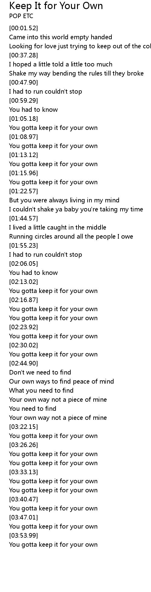 | [02:17.68] | You gotta keep it for your own |