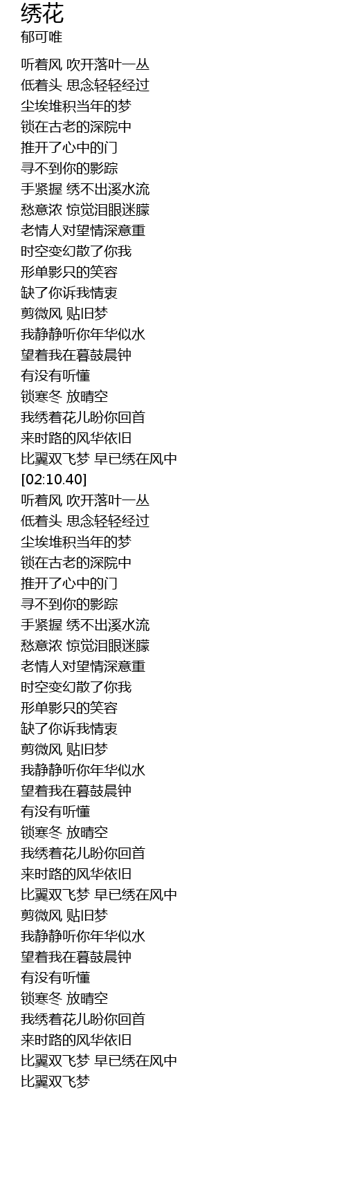 | [03:00.70] | 手紧握 绣不出溪水流 |