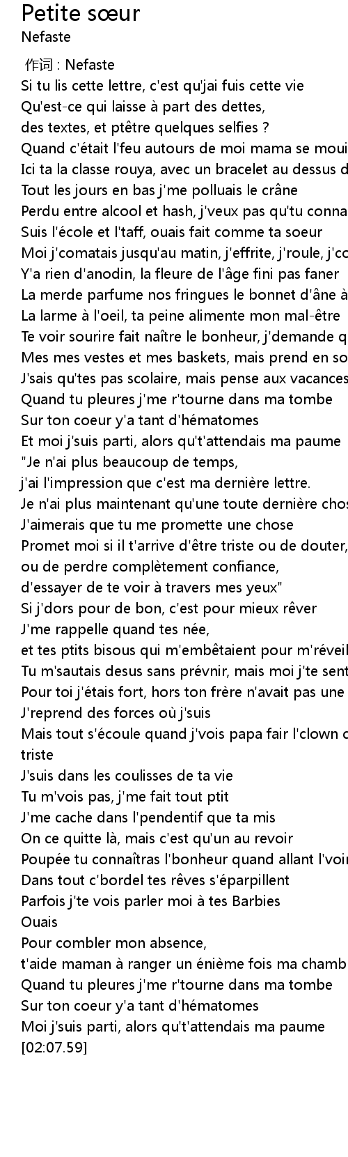 | [02:03.22] | Sur ton coeur y' a tant d' hé matomes |