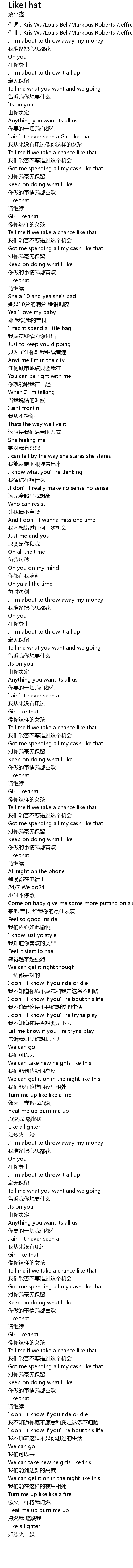 | 作词 : Kris Wu/Louis Bell/Markous Roberts /Jeffrey Smith | |
