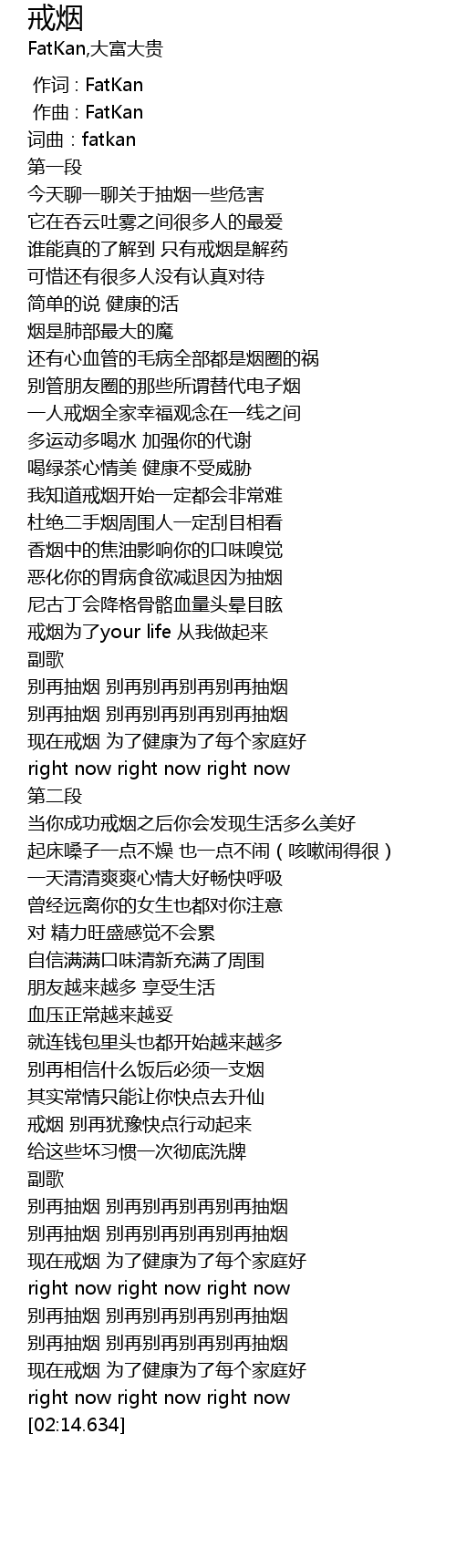 | [01:53.674] | 别再抽烟 别再别再别再别再抽烟 |