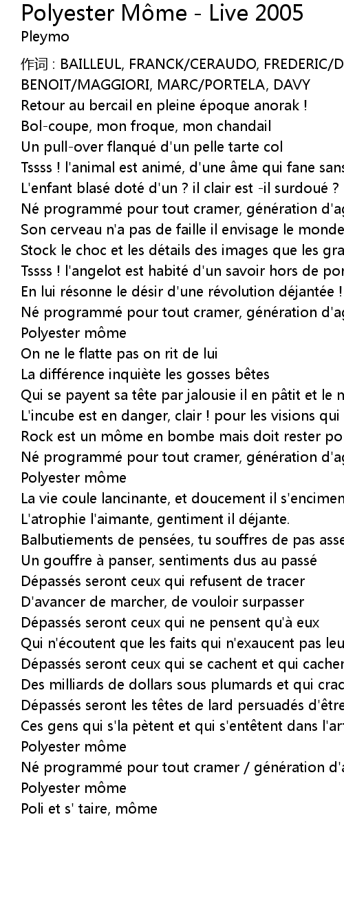 | 作词 : BAILLEUL, FRANCK/CERAUDO, FREDERIC/DEVILLOUTREYS, ERIK/JULLIARD, BENOIT/MAGGIORI, MARC/PORTELA, DAVY | |