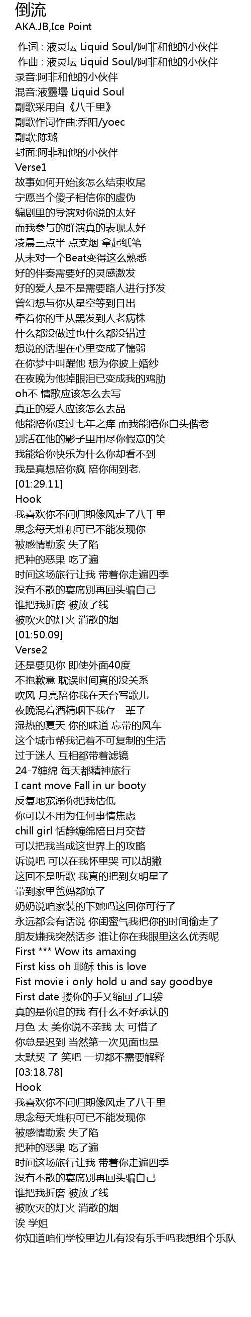 | [00:01.000] | zuò qǔ : yè líng tán Liquid Soul ā fēi hé tā de xiǎo huǒ bàn |