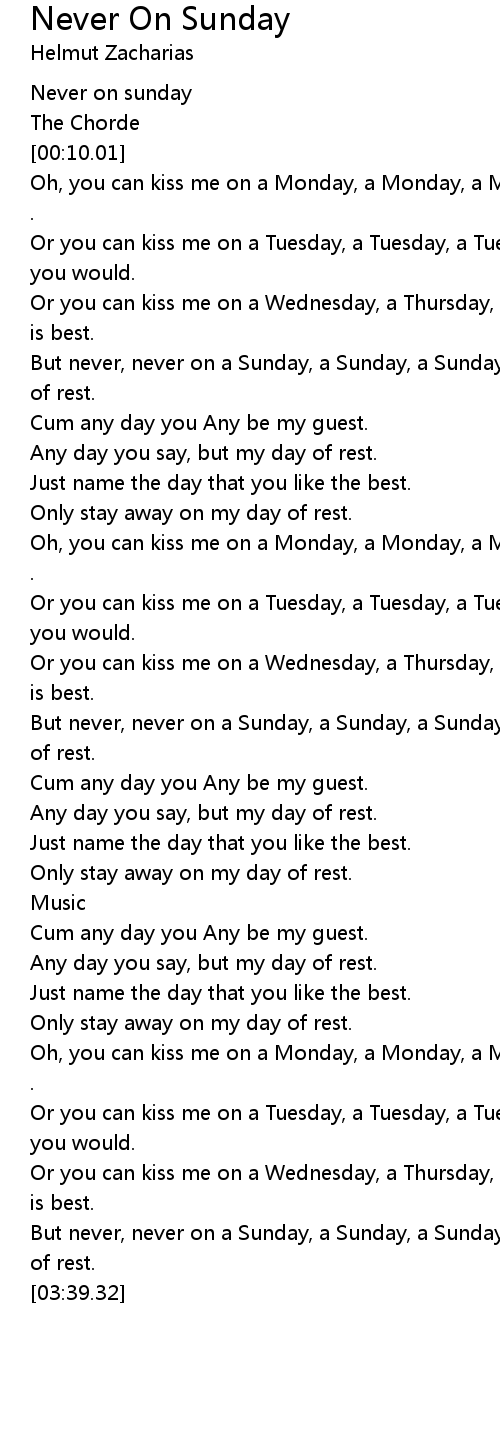 But never, never on a Sunday, a Sunday, a Sunday, cause that' s my day of rest. |