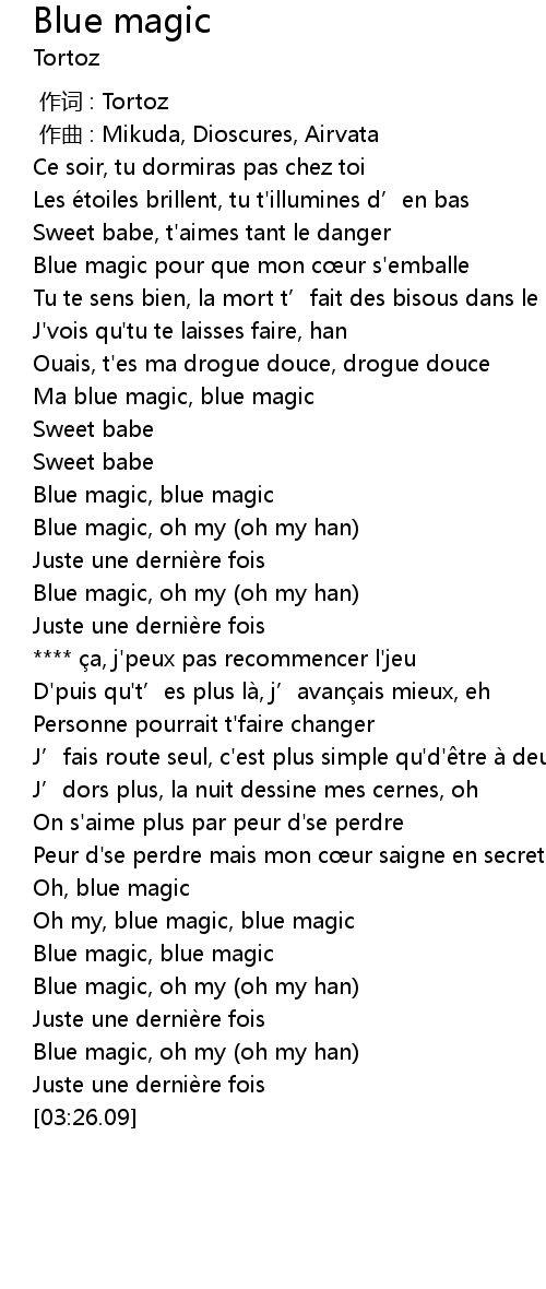 | [00:34.55] | Blue magic pour que mon cœur s'emballe |