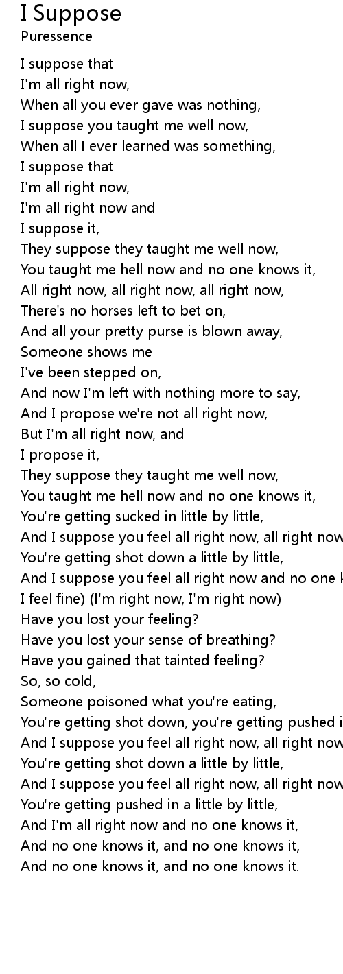 And I suppose you feel all right now and no one knows it, ( I've got nothing and I feel fine) (I'm right now, I'm right now) |