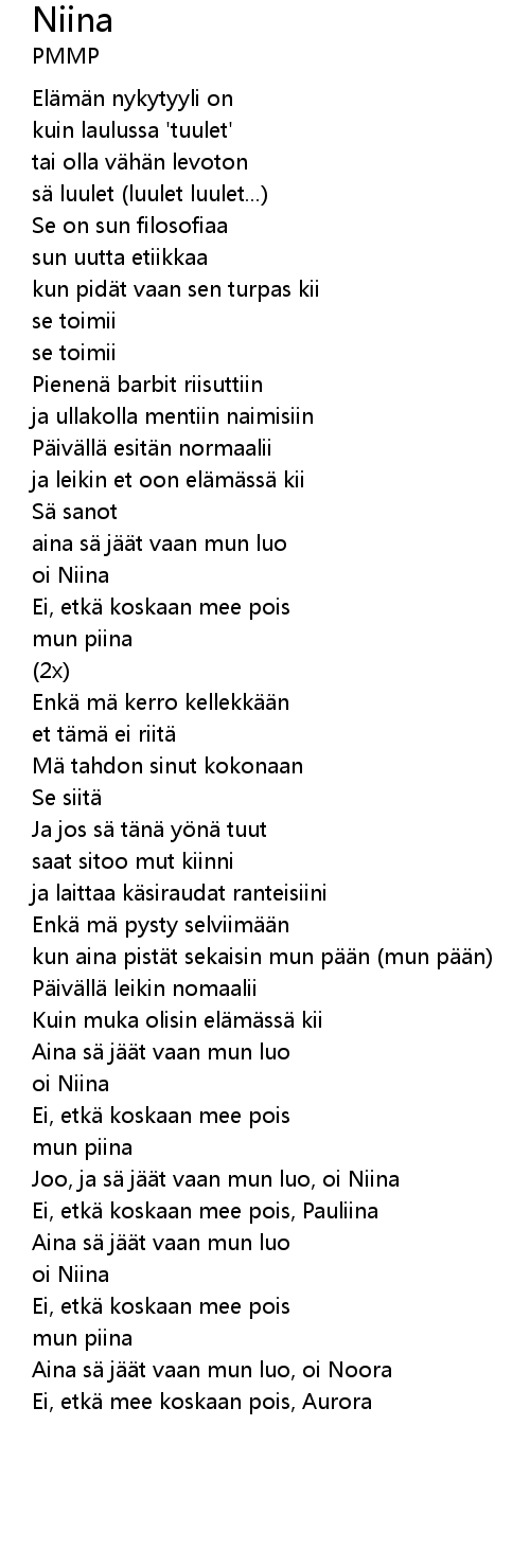 | Joo, ja sä jäät vaan mun luo, oi Niina | |