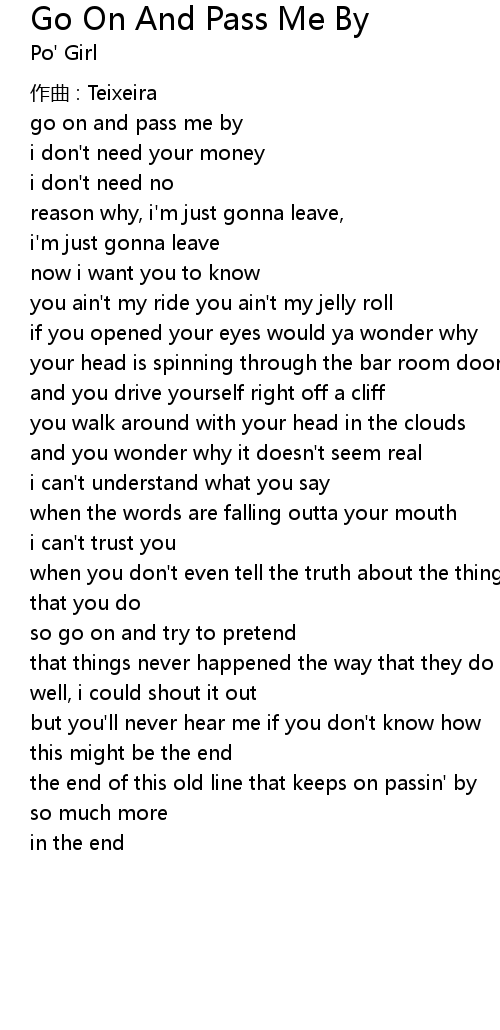 | Song | Go On And Pass Me By |