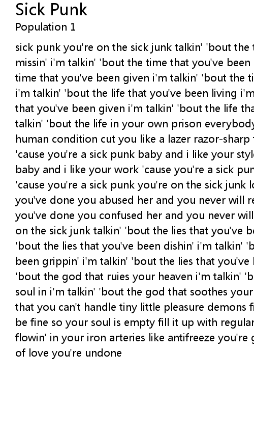 sick punk you're on the sick junk talkin' 'bout the time that you've been missin' i'm talkin' 'bout the time that you've been living i'm talkin' 'bout the time that you've been given i'm talkin' 'bout the time that you've been missin' i'm talkin' 'bout the life that you've been living i'm talkin' 'bout the life that you've been given i'm talkin' 'bout the life that you'll be killing i'm talkin' 'bout the life in your own prison everybody suffering is part of the human condition cut you like a lazer razor-sharp from head to toe numb you go 'cause you're a sick punk baby and i like your style 'cause you're a sick punk baby and i like your work 'cause you're a sick punk baby and i like your style 'cause you're a sick punk you're on the sick junk look at you now now look what you've done you abused her and you never will recover from it now look what you've done you confused her and you never will recover from it sick punk you're on the sick junk talkin' 'bout the lies that you've been livin' i'm talkin' 'bout the lies that you've been dishin' i'm talkin' 'bout the lies that you've been grippin' i'm talkin' 'bout the lies that you've been twistin' i'm talkin' 'bout the god that ruies your heaven i'm talkin' 'bout the god that sucks your soul in i'm talkin' 'bout the god that soothes your devil talkin' 'bout the god that you can't handle tiny little pleasure demons fighting for your mind you'll be fine so your soul is empty fill it up with regular it's popular feel it flowin' in your iron arteries like antifreeze you're good reminder off the agony of love you're undone |